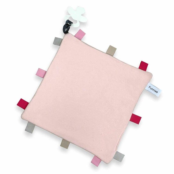 Zacht roze tutdoek met labels voor aan de fopspeen. Het doekje kan worden gepersonaliseerd met naam.