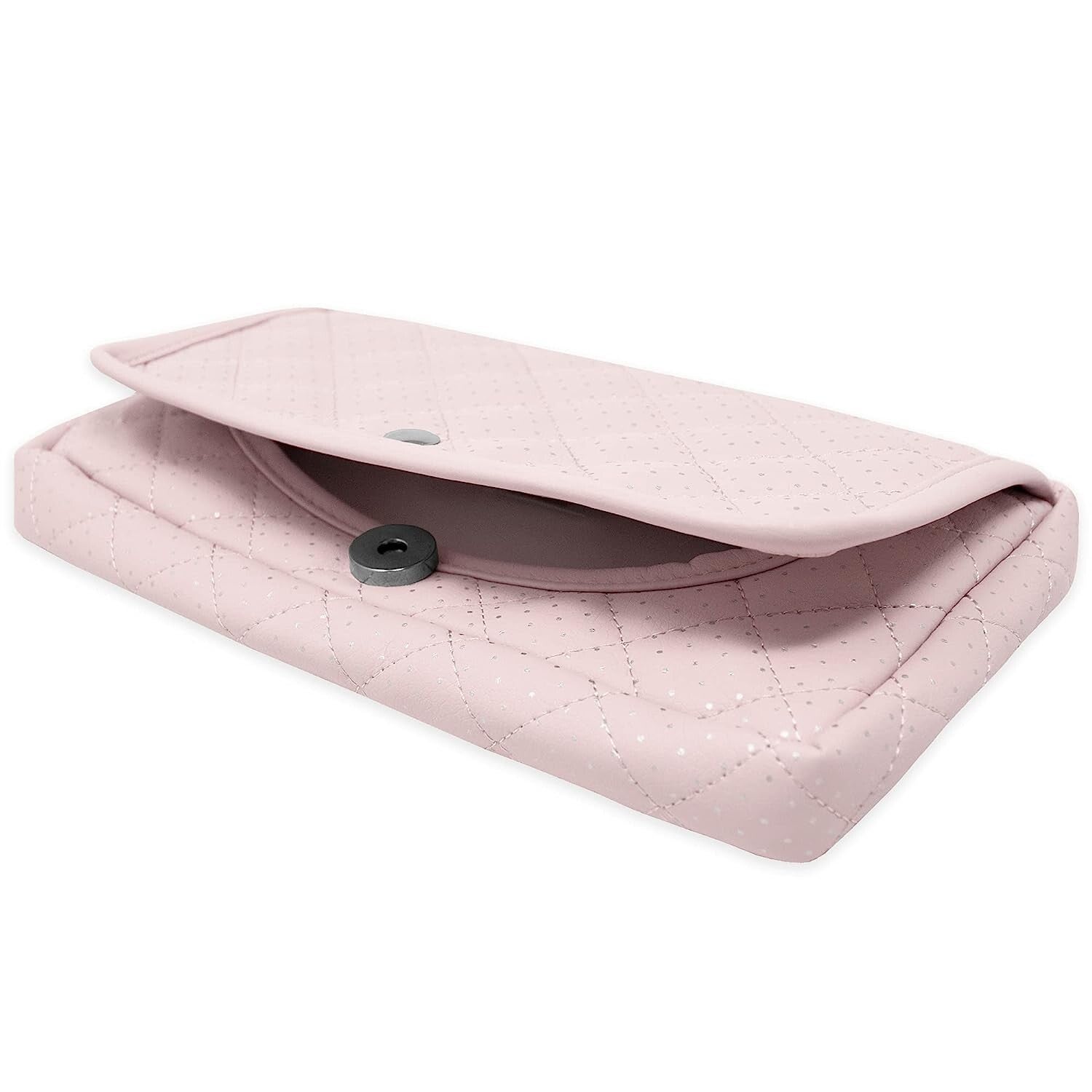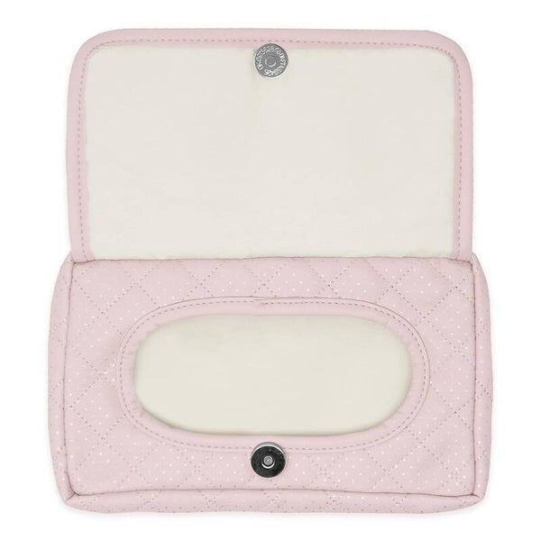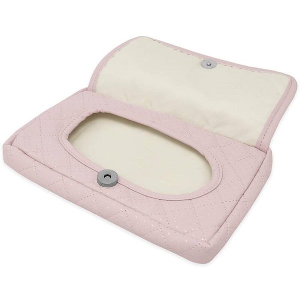 Deze etui voor vochtige tissues is gemaakt van kunstleer en is voorzien van een zilveren drukknoop. Ideaal om mee te nemen in de luiertas en gemakkelijk schoon te houden.