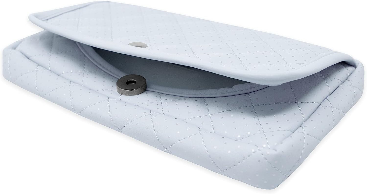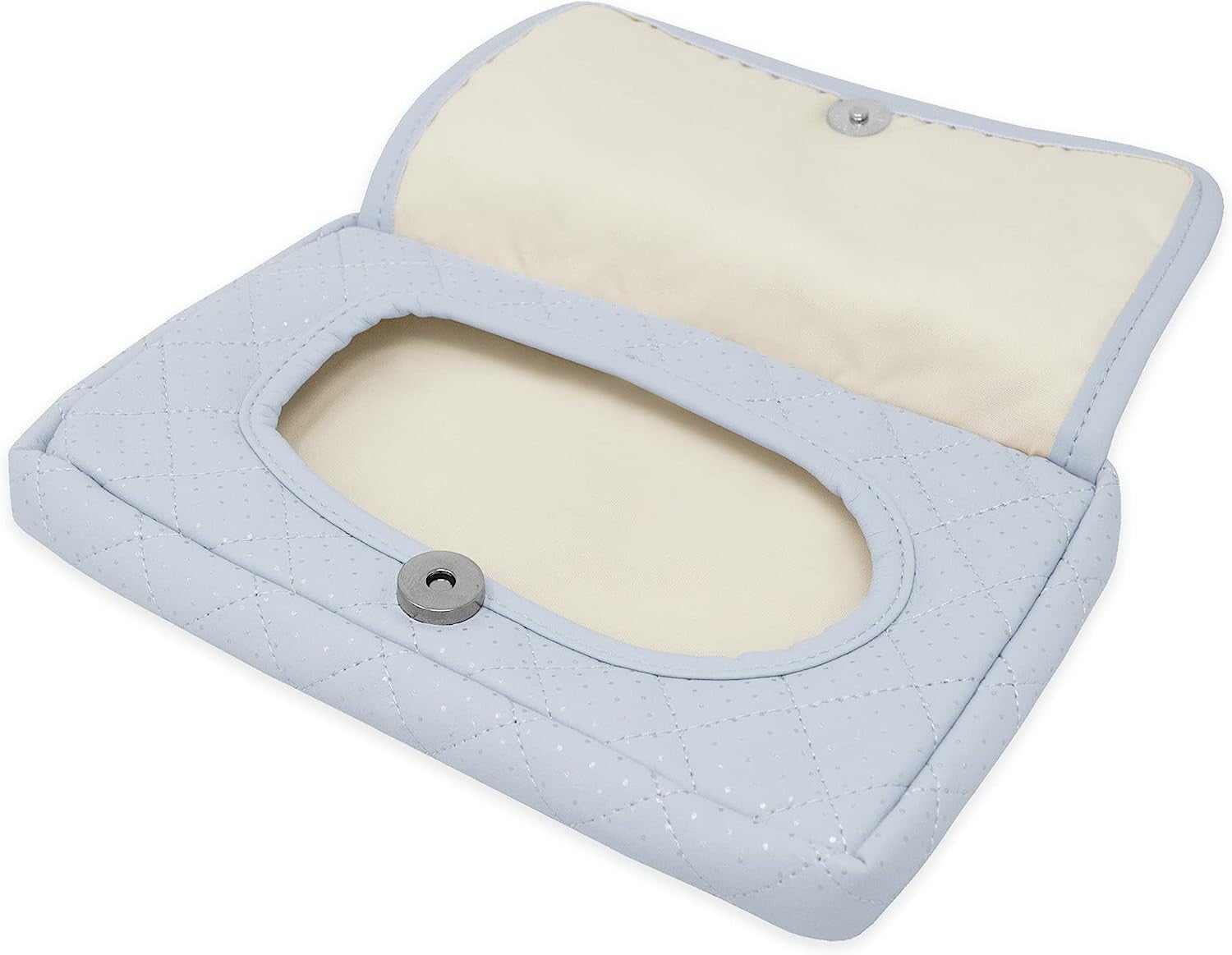 Deze etui voor vochtige tissues is gemaakt van kunstleer en is voorzien van een zilveren drukknoop. Ideaal om mee te nemen in de luiertas en gemakkelijk schoon te houden.