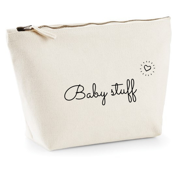 De tekst Baby Stuff met het hartje is geborduurd en zal daarom ook niet vervagen.