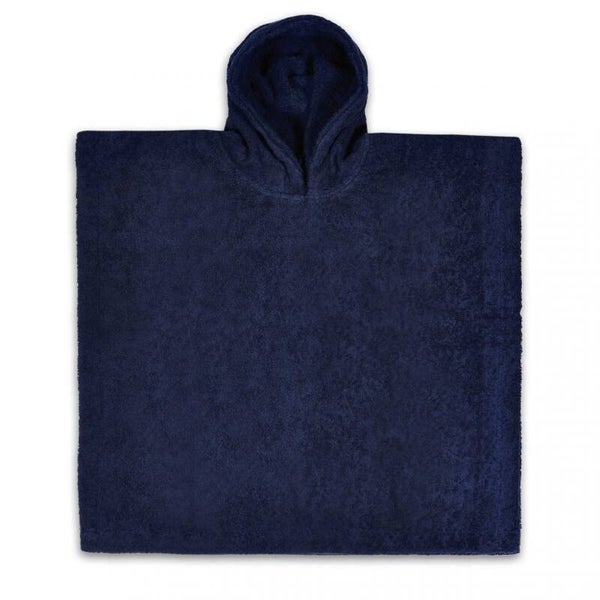 Heerlijk zachte, donkerblauwe badstof poncho met capuchon van Funnies. Handig voor na het douchen, badderen of zwemmen.