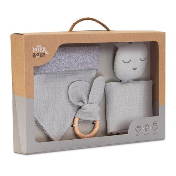 Babycadeau setje met hydrofiel Dou Dou knuffeldoekje, bandana slab en bijtring.