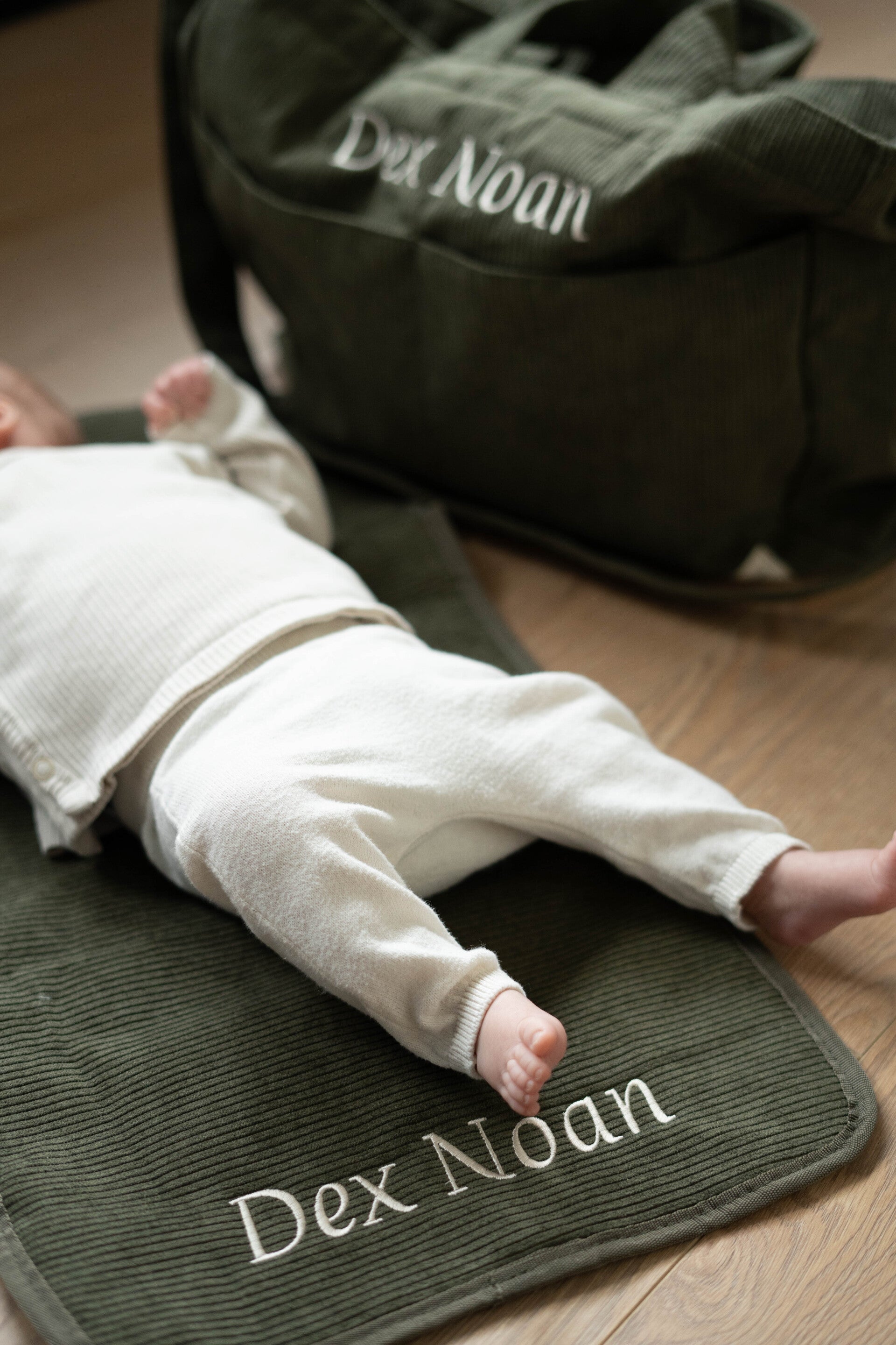 Zowel de tas als het matje kunnen met naam worden geborduurd, zie de opties bij het artikel.