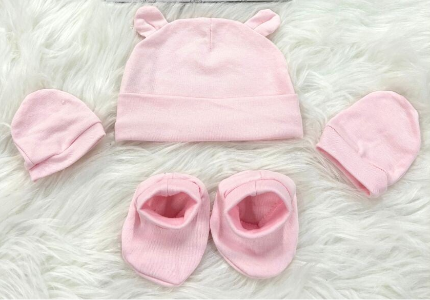 Dit schattige setje van katoen bestaat uit een wit mutsje met beren oortjes, krabwantjes en slofjes in de kleur roze.