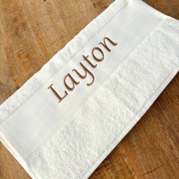 Stralend witte handdoek van stevig en zacht katoen. De handdoek wordt met naam geborduurd op de band.