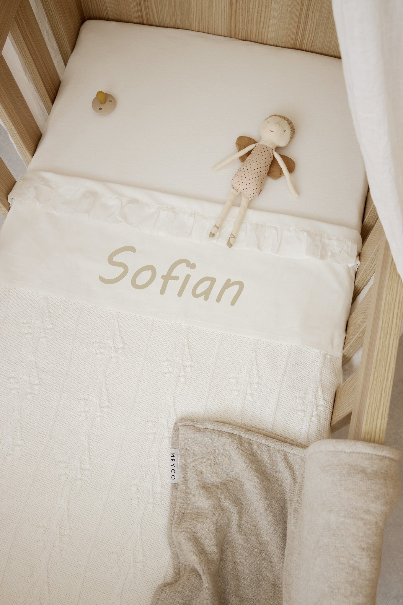 Gebroken wit lakentje voor in de wieg met elegante ruches rand van Meyco Baby.