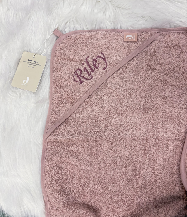 De badcape kan met naam worden geborduurd op de muts, zie de opties bij het artikel.