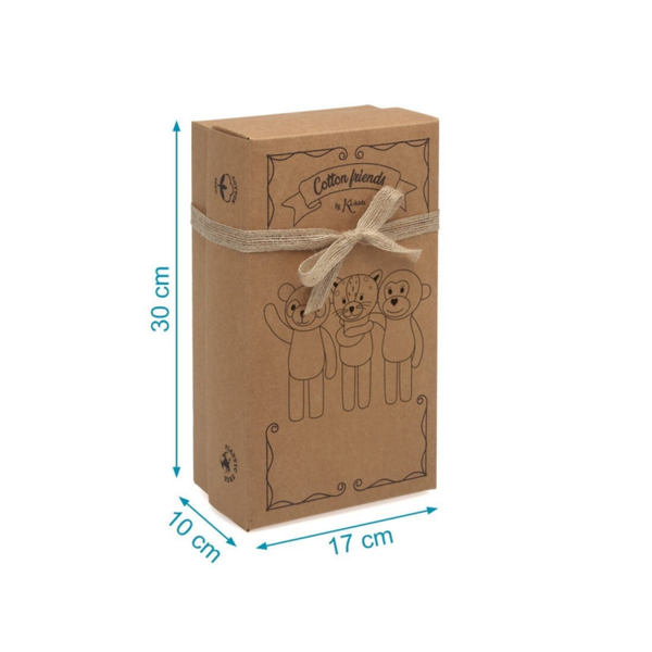 De Dou Dou wordt geleverd in een herbruikbaar, plasticvrij doosje, dichtgebonden met natuurlijke vezelkoorden. Veilig getest voor kindjes onder de 3 jaar én gemaakt met oog voor de planeet.