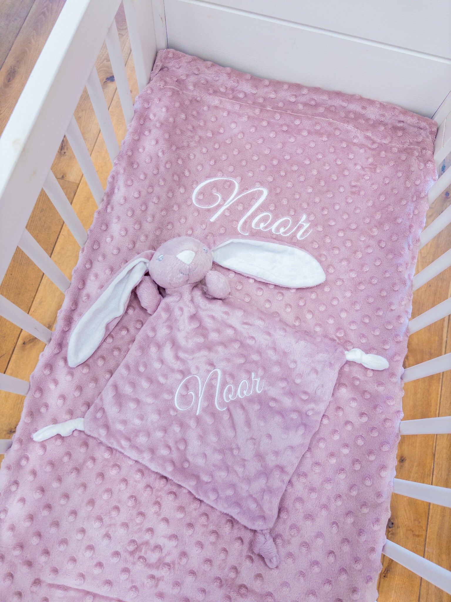 Zowel het knuffeldoekje als het dekentje kunnen worden voorzien van een geborduurde naam.
