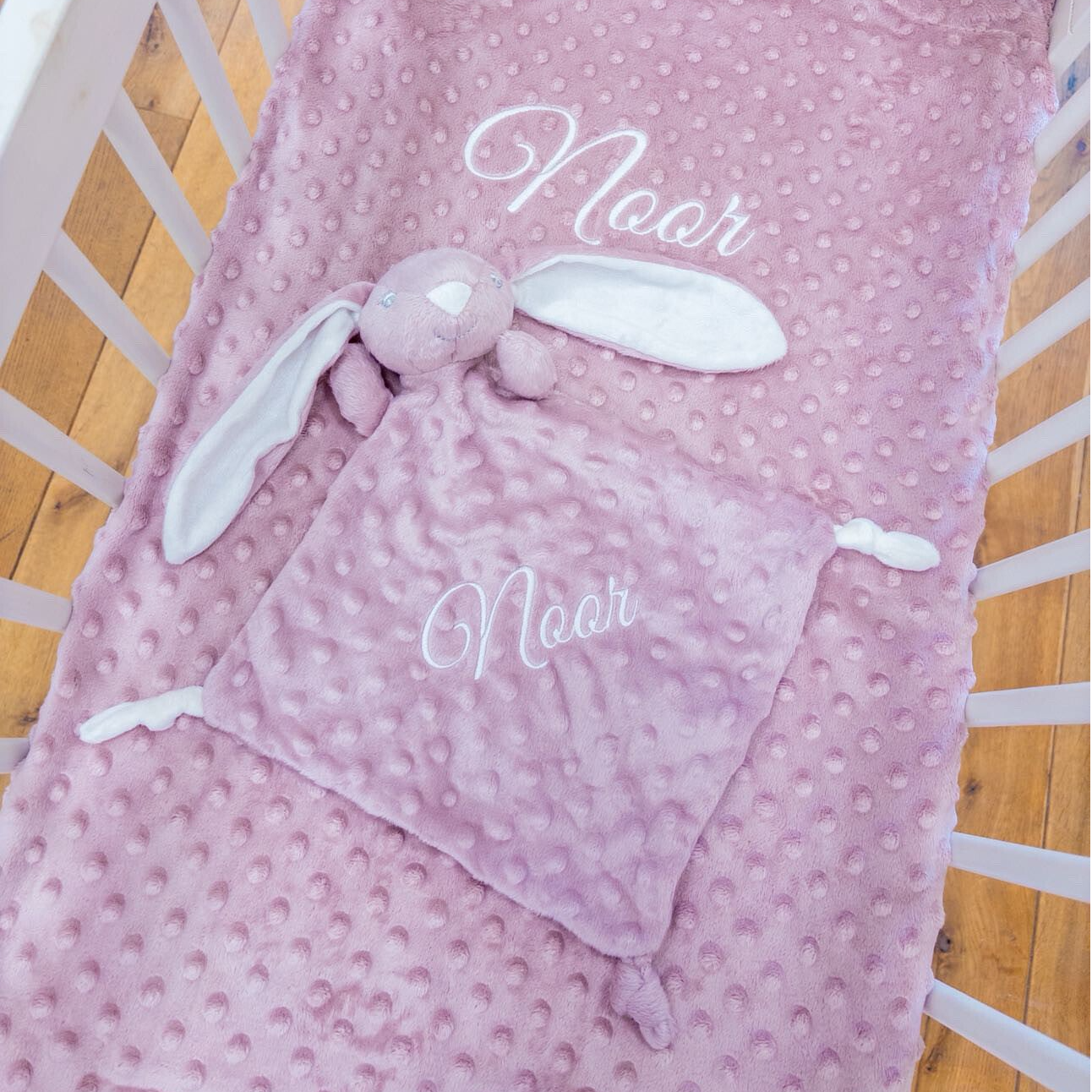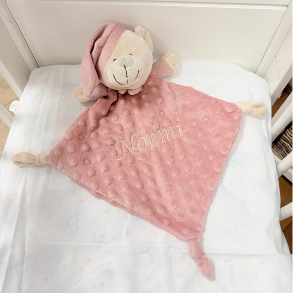 Het knuffeldoekje kan met naam en eventueel geboortedatum worden geborduurd, zie de opties bij het artikel.