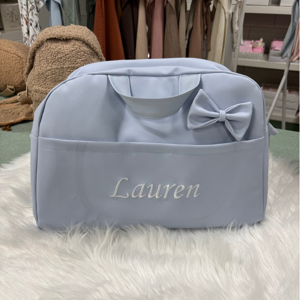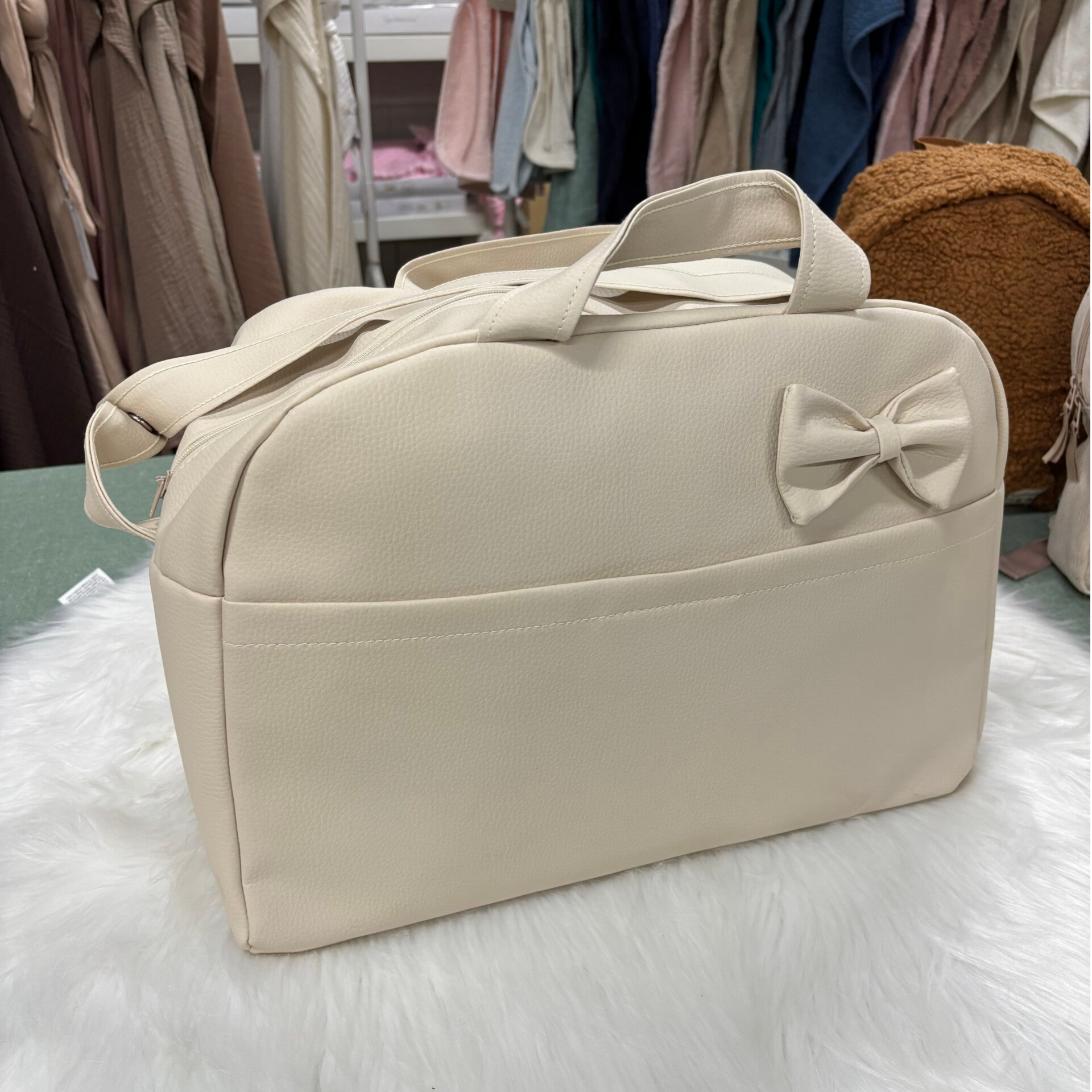 Mooie stevige luiertas / draagtas met strik en voorvak voor aan de kinderwagen. Voorzien van ritssluiting, schouderband en 2 handvatten. Aan de binnenzijde zitten nog 2 extra steekvakken.