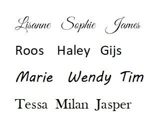 Zie de opties bij het artikel. Staat er iets niet tussen wat je wenst, bijvoorbeeld een kleur garen waarmee je het graag geborduurd zou willen hebben? Stuur dan je wensen mee in het opmerkingenveld. Ook het lettertype kan daarin worden aangegeven.