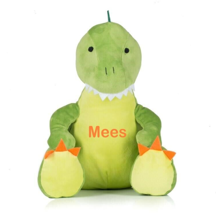 Wij kunnen deze dino knuffel ook voor je personaliseren met een mooie naam borduring op het buikje. Zie de opties bij het artikel.